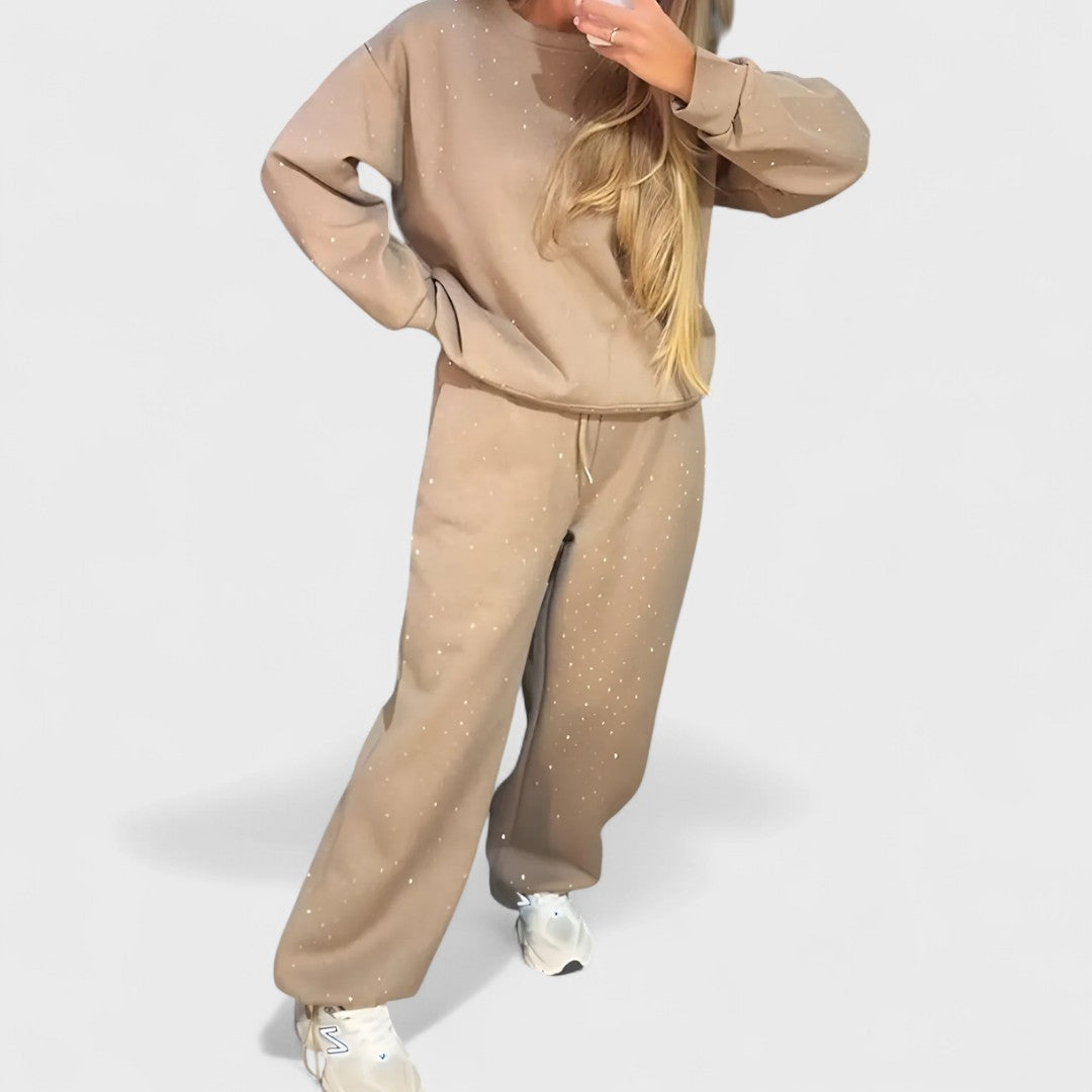 Das Amélie-Set vereint Komfort und Raffinesse in einem modernen Design, das durch zarte, glitzernde Details bereichert wird. Perfekt für alle, die sich bequem fühlen möchten, ohne auf einen Hauch von Eleganz zu verzichten, ist es ideal für die Freizeit, informelle Ausflüge oder stilvolle Entspannungsmomente. Hergestellt aus weichem und atmungsaktivem Stoff, begleitet es die Bewegungen mit Leichtigkeit und verleiht einen strahlenden und eleganten Look.