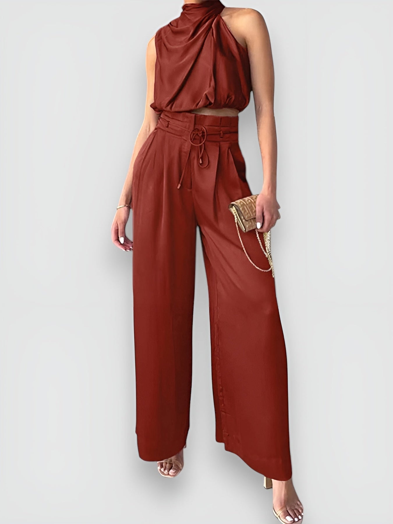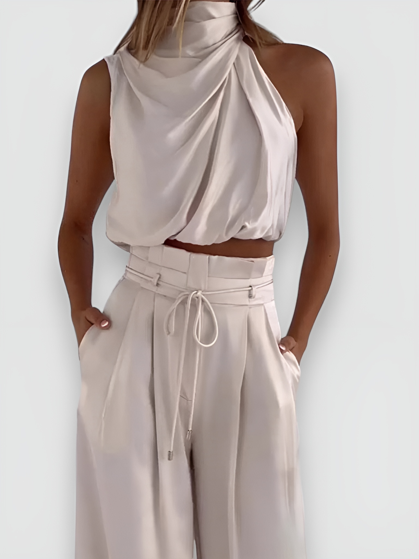 Dieses elegante Set besteht aus einem ärmellosen Top und weit geschnittenen Hosen, perfekt für einen anspruchsvollen Sommerlook.